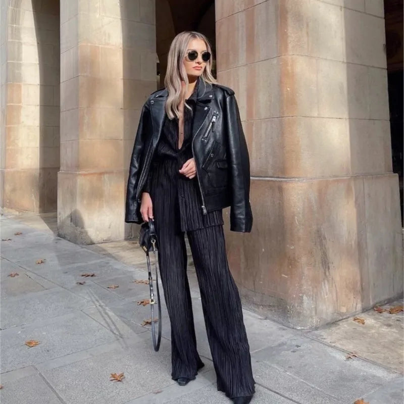 - Comfort Fit: The wide-leg trousers and turn-down collar provide a relaxed yet fashionable look.