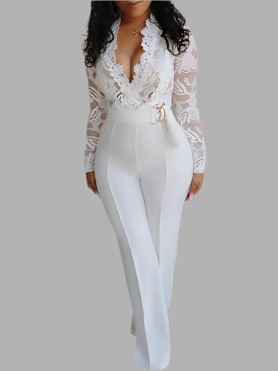 Elegant White Lace-Trimmed Long Sleeve Jumpsuit for Women