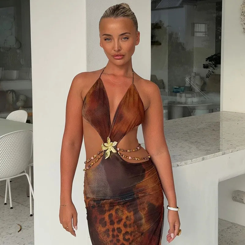 Whether you're hitting the dance floor or enjoying a sunset dinner, this Leopard Print Deep V-Neck Maxi Dress is sure to turn heads. Don't miss out on this fashionable addition to your wardrobe!