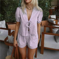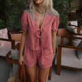- Fashionable Design: This two-piece set features a loose-fitting, hollow-out V-neck top paired with comfortable shorts, ensuring you stay stylish and comfortable.