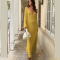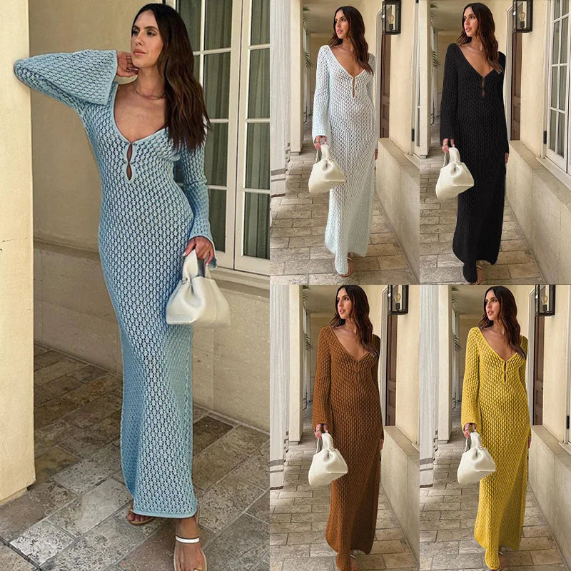 Step out in style this spring and summer with our Women's Hollow Out Deep V-Neck Long Sleeve Knit Dress, perfect for beach clubs and elegant gatherings. This stunning knit dress showcases a blend of comfort and sophistication, making it a must-have addition to your wardrobe.
